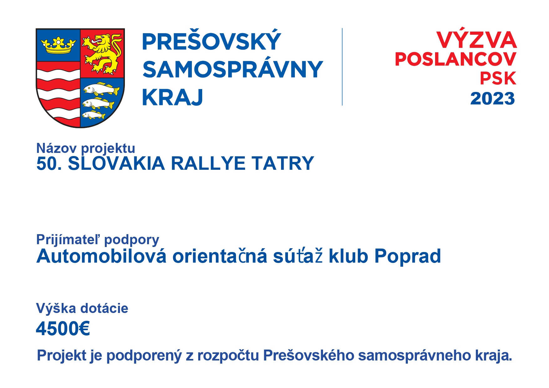Organizačný výbor 50. Slovakia Rallye Tatry ďakuje za podporu poslancom Prešovského samosprávneho kraja
